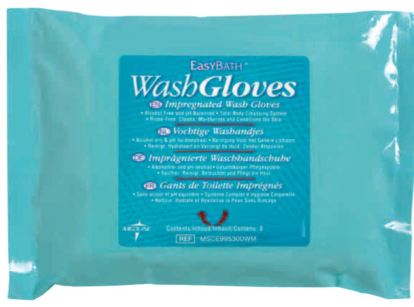 A mosdatókesztyűk is nyolcasával vannak csomagolva. Kialakításuk lehetővé teszi, hogy ráhúzzuk kezünkre, így kényelmesebb a mosdatás. Antibakteriális változatban is forgalomba kerülnek. Kisebb termetű páciensek, vagy gyermekek mosdatásához öt darabos csomagolásban is rendelkezésre állnak.